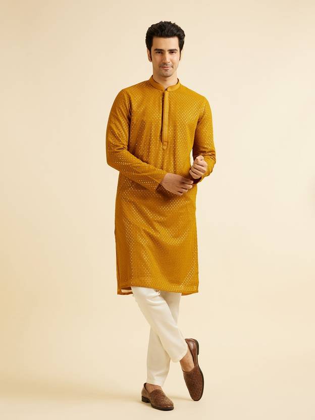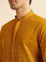 Manyavar Mustard Self Patterned Mirror Work Kurta Set for Men