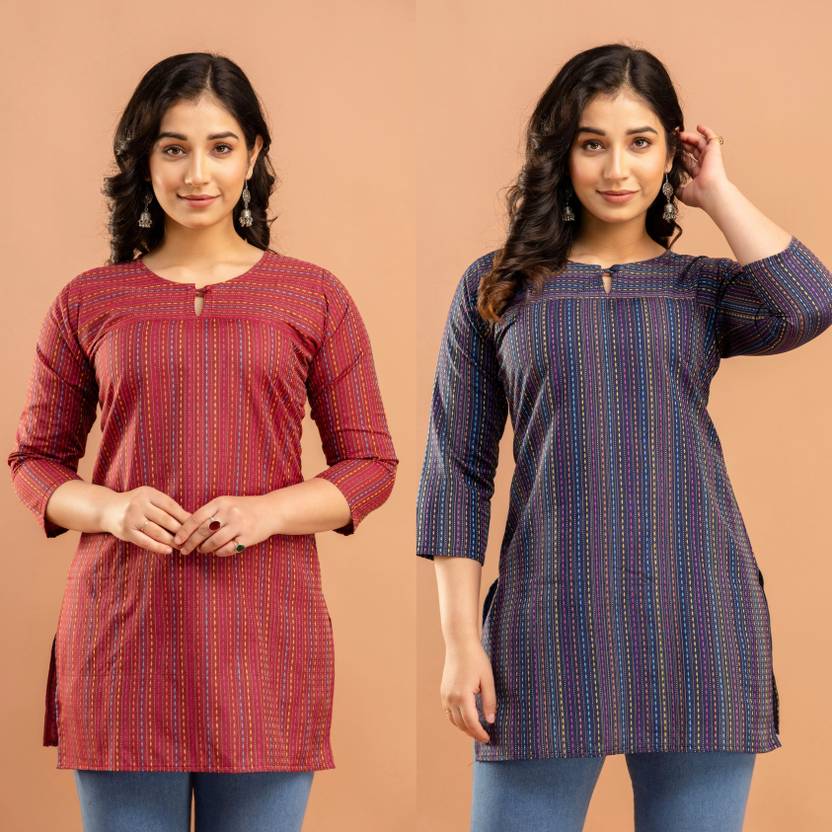 Combo of 2 stylish short kurtis for women, Designed with a regular fit to flatter all body types and ensure comfort, Hip-length kurtis ideal for pairing with jeans, leggings, or palazzos, Made from breathable and soft fabric for all-day comfort in any season, Suitable for casual wear, office wear, or small gatherings and outings
