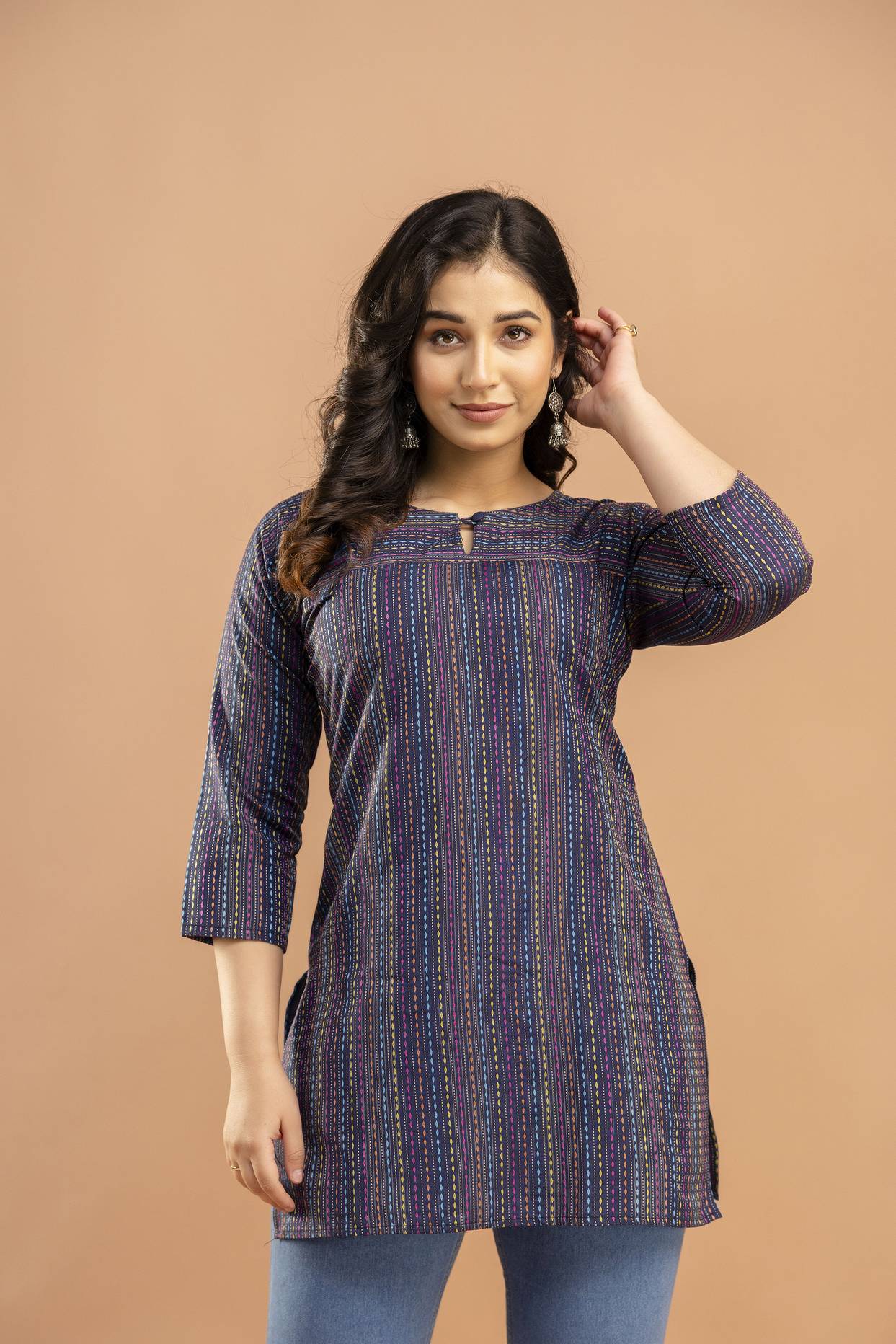 Enhance your ethnic wardrobe with this elegant short kurti featuring a beautiful dotted booti design. Crafted for comfort and style, it comes with 3/4 sleeves and a trendy short length, making it perfect for casual and semi-formal occasions. Pair it with jeans, leggings, or palazzos for a chic and effortless look.