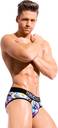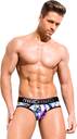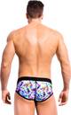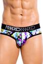 The Zerox Brief features a posterized pop art print that includes shades of blue, purple, and green against sleek black strapping and binding, Marco Marco’s signature black center stitching on the crotch, and a soft black brushed elastic waistband.