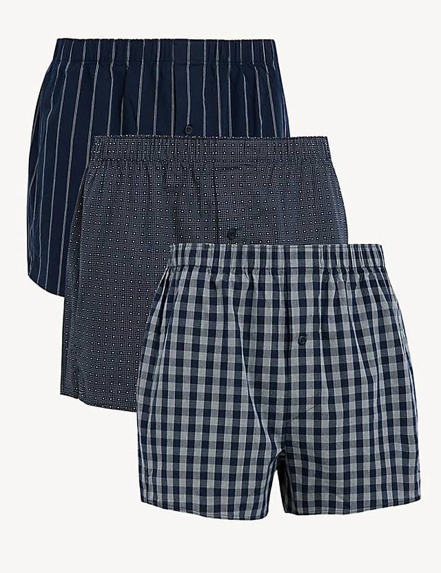 Choose from checks, stripes or spots with this three-pack of boxers. Comfy loose-fitting styles, made from soft woven cotton. Functional button flys and elasticated waists. StayNew™ technology helps the fabric retains its colour, wash after wash.