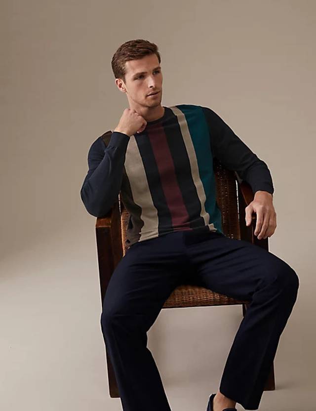 Elevate your casual wardrobe with this luxurious jumper from our Autograph collection. It's made in a crew neck design from premium cotton for strength and softness. The stylish vertical stripes make it a perfect party piece and Autograph branded trims add a smart finish. This piece is part of our Big & Tall range, created to fit larger frames.