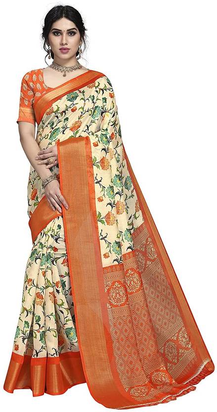 Printed Daily Wear Cotton Silk Saree (Orange)