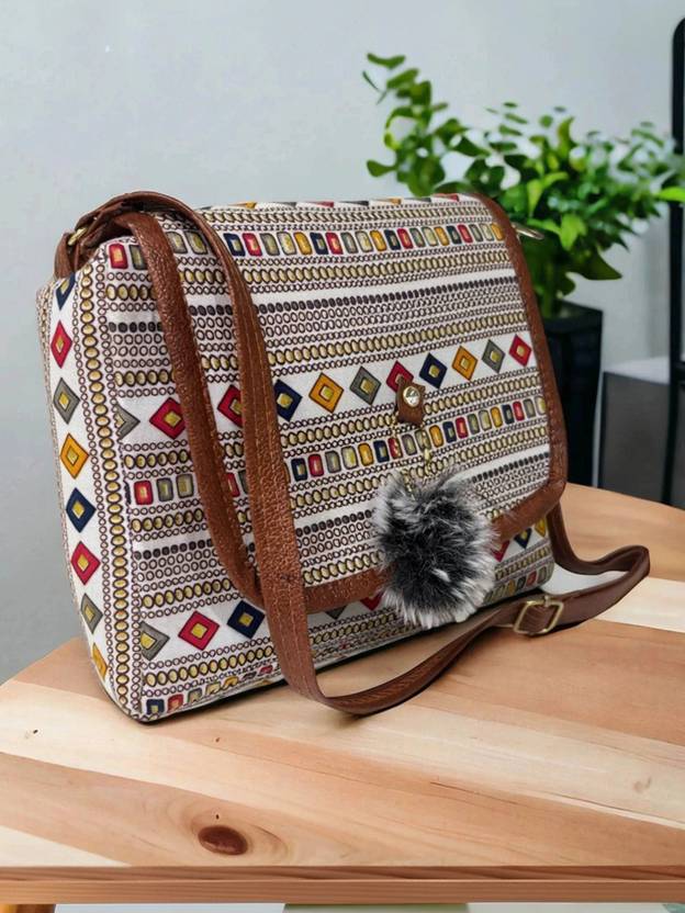 mas navi White, Brown Sling Bag Imported Fabric Vegan Leather Fashion Bags