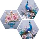 Masstone Peacock with Pink Flower Modern Art 3 Piece Hexagon MDF Painting Digital Reprint 21.5 inch x 21.5 inch Painting  (With Frame, Pack of 3)