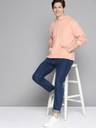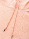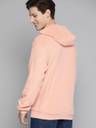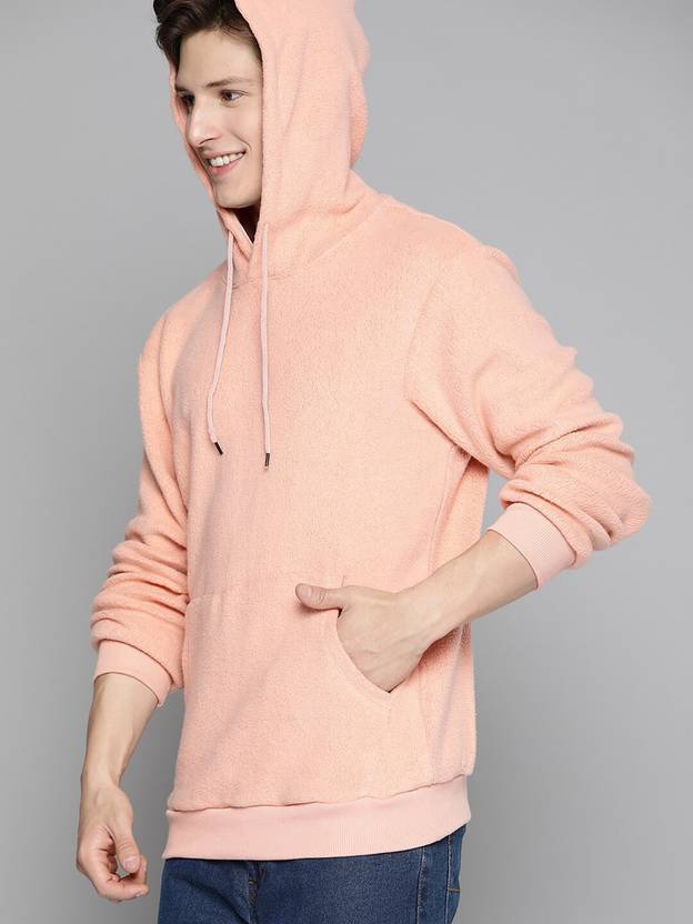 Peach-coloured self design sherpa sweatshirt, has a hood, 1 kangaroo pocket , long sleeves, straight hem.