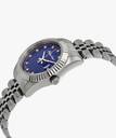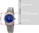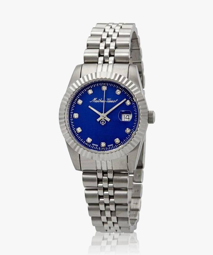 Silver-tone stainless steel case with a silver-tone stainless steel bracelet. Fixed silver-tone stainless steel bezel. Blue dial with silver-tone hands and crystal hour markers. Minute markers around the outer rim. Dial Type: Analog. Luminescent hands and markers. Date display at the 3 o'clock position. Ronda Caliber 585 quartz movement. Scratch resistant mineral crystal. Pull / push crown. Solid case back. Round case shape, case size: 30 mm, case thickness: 3 mm. Fold over clasp. Water resistant at 30 meters / 100 feet. Functions: date, hour, minute, second. Casual watch style. Watch label: Swiss Made. Mathey-Tissot Mathey III Quartz Crystal Blue Dial Ladies Watch D810ABU.