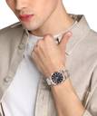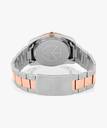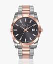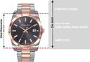 Silver-tone stainless steel case with a two-tone (silver-tone and rose gold PVD) stainless steel bracelet. Fixed rose gold PVD stainless steel bezel. Black dial with luminous rose gold-tone hands and index hour markers. Minute markers around the outer rim. Dial Type: Analog. Luminescent hands and markers. Date display at the 3 o'clock position. Ronda Caliber 505 quartz movement. Scratch resistant mineral crystal. Pull / push crown. Solid case back. Round case shape, case size: 40 mm, case thickness: 11 mm. Band width: 20 mm. Fold over with safety release clasp. Water resistant at 50 meters / 165 feet. Functions: date, hour, minute, second. Casual watch style. Watch label: Swiss Movt. Mathey-Tissot Mathey I Quartz Black Dial Mens Watch H450RN.