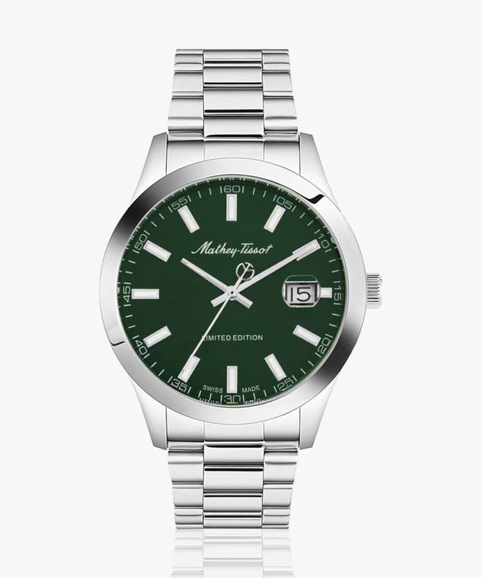 Stainless steel case with a stainless steel bracelet. Fixed stainless steel bezel. Green dial with luminous silver-tone hands and index hour markers. Arabic numeral minute markers (at 5 minute intervals). Minute markers around the outer rim. Dial Type: Analog. Luminescent hands and markers. Date display at the 3 o'clock position. Ronda caliber 505 quartz movement. Scratch resistant mineral crystal. Pull / push crown. Solid case back. Round case shape. Case size: 42 mm. Case thickness: 11 mm. Band width: 22 mm. Fold over clasp. Water resistant at 50 meters / 165 feet. Functions: date, hour, minute, second. Mathy I Le Series. Casual watch style. Watch label: Swiss Made. Mathey-Tissot Mathy I LE Quartz Green Dial Men's Watch H451VE.