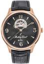 Rose gold-tone stainless steel case with a black genuine leather strap. Fixed rose gold-tone stainless steel bezel. Black dial with rose gold-tone hands and Arabic numeral & index hour markers. Minute markers around the outer rim. Dial Type: Analog. Landeron 24OH automatic movement. Scratch resistant sapphire crystal. Pull / push crown. Transparent case back. Round case shape, case size: 42 mm. Deployment with push button release clasp. Water resistant at 50 meters / 165 feet. Functions: hour, minute, second. Edmond Auto Havana Series. Casual watch style. Watch label: Swiss Made. Mathey-Tissot Edmond Auto Havana Automatic Black Dial Men's Watch MC1886CN.