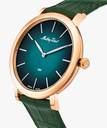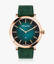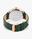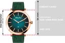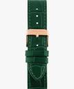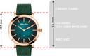 rose gold tone case with a Genuine Leather and green color straps. Fixed stainless steel bezel. green dial with rose gold-tone hands and index markers. Minute markers around the outer rim. Dial Type: Analog. hands and markers. Scratch resistant sapphire crystal.olid case back. Round case shape. Case size: 40.5 mm. Case thickness: 5.5 mm. Band width: 20 mm. Deployment clasp with a push button release. Water resistant at 50 meters.