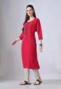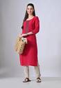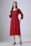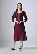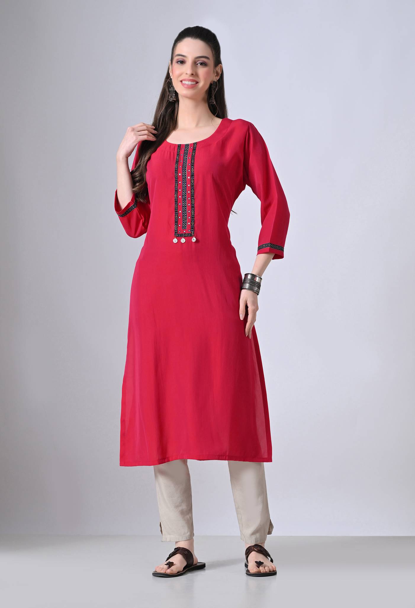 Upgrade your ethnic wardrobe with this beautifully designed MAURYA Women’s Straight Fit Silk Kurti, crafted to offer the perfect balance of elegance, comfort, and everyday sophistication. Made from premium-quality silk fabric, this kurti features a smooth texture with a graceful fall that enhances your silhouette while ensuring all-day comfort. The kurti showcases a stylish straight-cut design that flatters all body types, making it a versatile choice for women of all ages. The highlight of this kurta is its ornate yoke work embellished with delicate mirror detailing, adding a subtle festive charm without being overpowering. The elegant yoke design draws attention to the neckline, giving the kurti a refined and classy appeal. Designed with a round neck and three-quarter sleeves, this straight kurti offers a perfect blend of traditional aesthetics and modern styling. The calf-length silhouette makes it ideal to pair with leggings, palazzos, straight pants, or trousers for a complete ethnic or fusion look. Whether styled minimally for office wear or accessorized for festive occasions, this kurti adapts effortlessly to your needs. The silk fabric kurti for women is lightweight, breathable, and comfortable for long hours, making it suitable for daily wear, office wear, casual outings, family gatherings, festive occasions, parties, and gifting purposes. The rich solid color combined with detailed yoke mirror work makes it a timeless wardrobe essential.