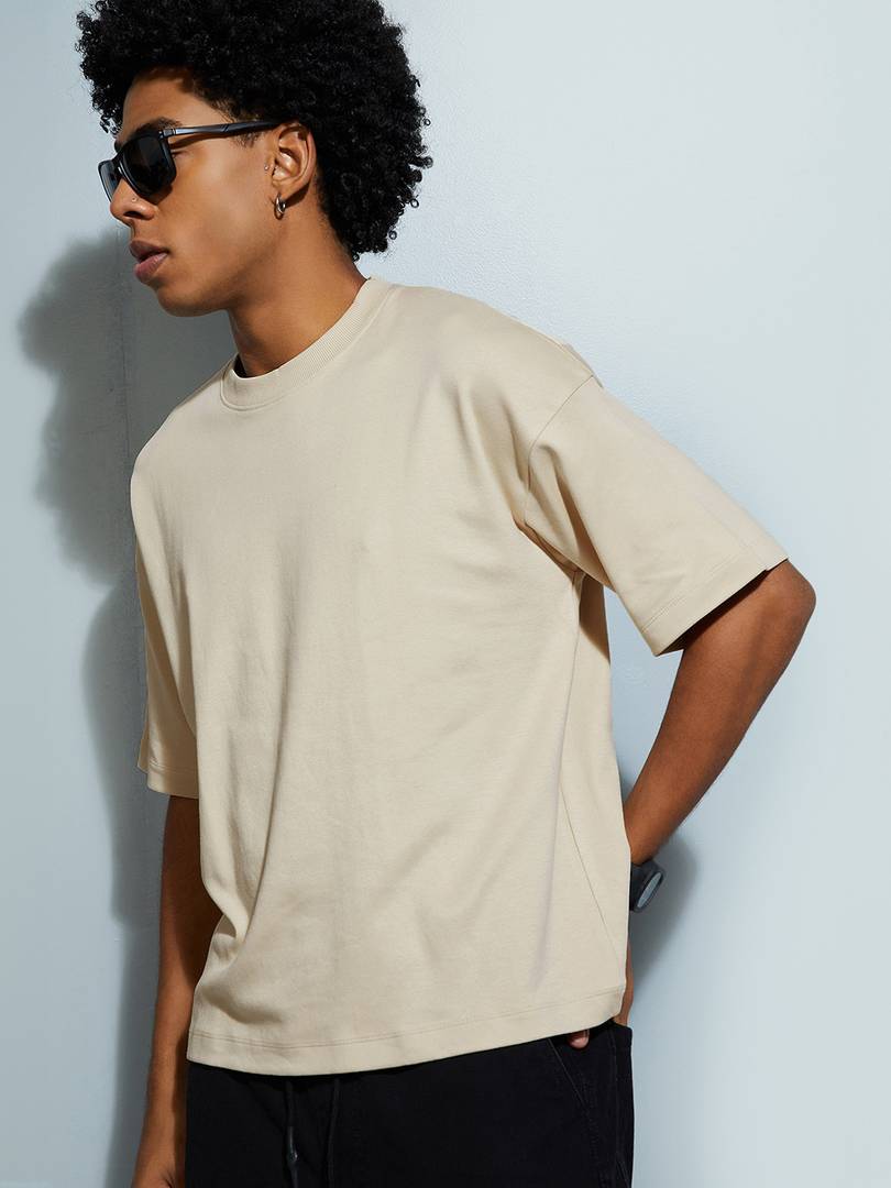 URB_N Men Solid Round Neck Pure Cotton Beige T-Shirt