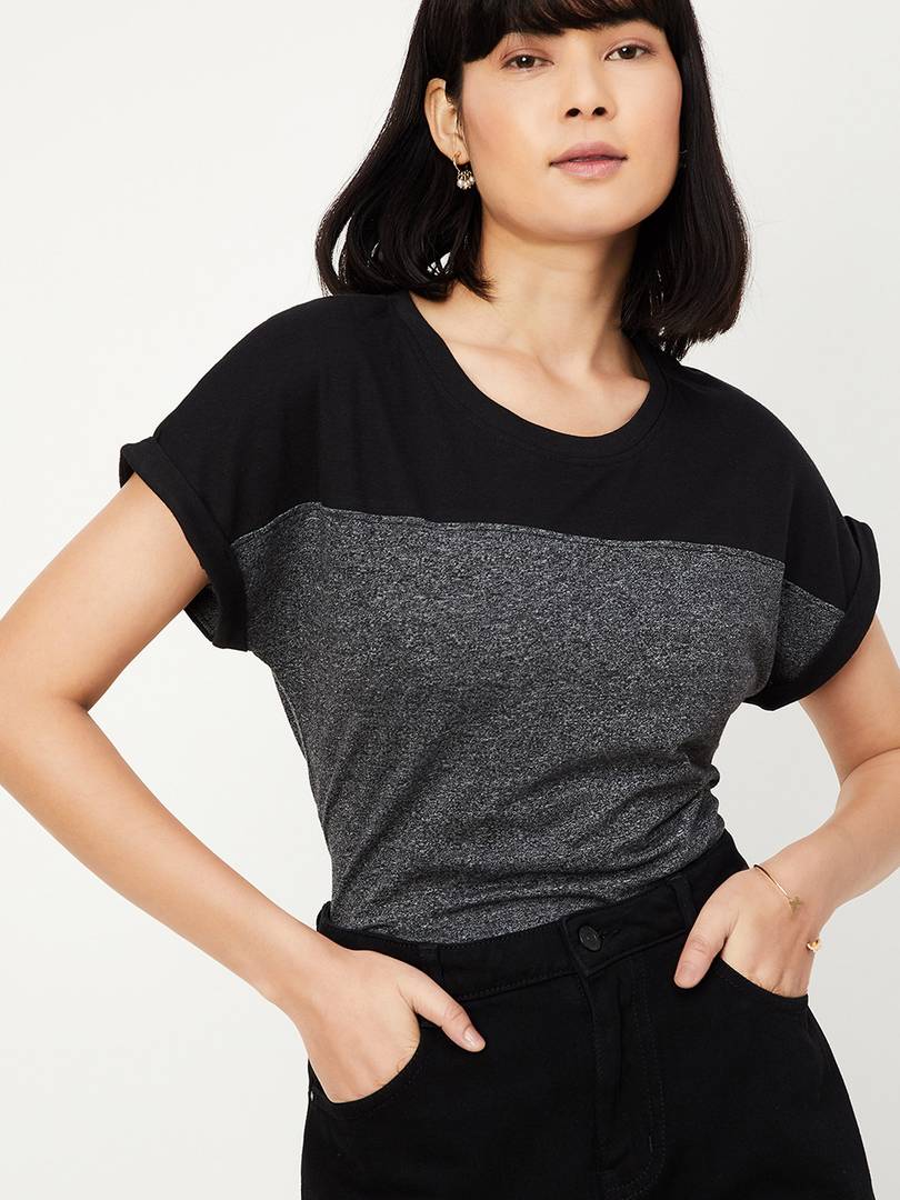 MAX Solid Women Round Neck Black T-Shirt