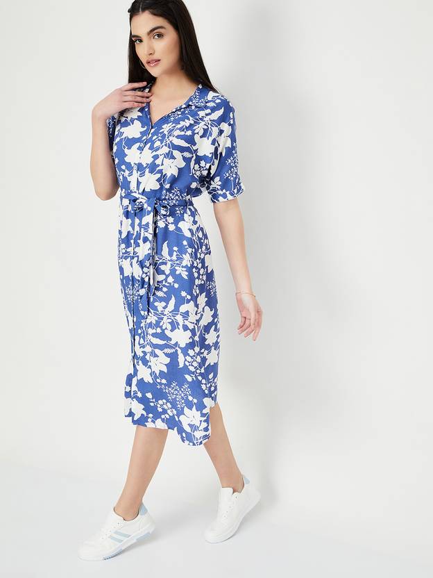 MAX Women A-line Blue, White Knee Length Dress