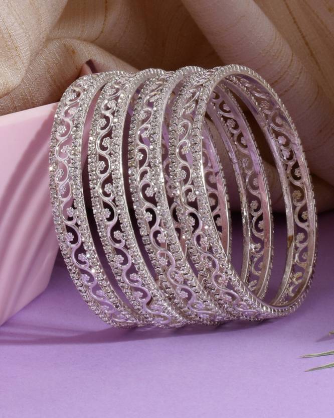 This set of bangles is not just an accessory but a statement of style that stands out in any crowd. Whether it’s the shine of the high-quality silver plating or the durability of the brass material, these bangles are designed to last. The American diamond chains roll elegantly around the wrist, complemented by the intricate floral designs that signify the craftsmanship of KEWAI. Trusted by a vast customer base, these bangles are a testament to quality and elegance.
