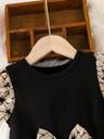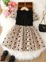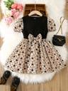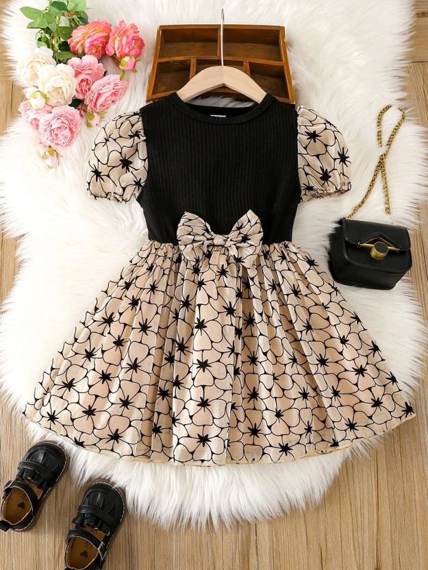 The product is a stylish and colorful girl's dress featuring a modern, elegant design. The top portion of the dress is solid black with short puffed sleeves and decorative buttons down the front. A light beige belt with a bow adds a charming detail at the waistline.