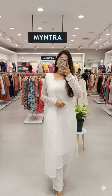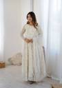 Embrace timeless elegance with this beautiful off-white georgette gown from Zahi Creation. Crafted from lightweight and flowy georgette fabric, this gown showcases a delicate floral print that radiates feminine charm and sophistication. The crepe inner lining ensures a smooth and comfortable fit while enhancing the gown’s graceful drape.