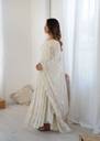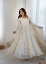 Featuring a classic round neckline and full sheer sleeves, this gown is designed to exude subtle glamour with every swirl of its voluminous flare. It comes paired with a matching georgette dupatta, completing the look with refined elegance.
