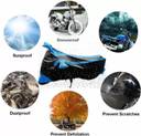 Featuring robust protection against sun, rain, snow, wind, and bird droppings, this cover ensures your bike stays safe in all conditions. Sporting a design that shields your vehicle from harsh weather, this cover prevents damage caused by prolonged exposure to the elements. Thanks to its comprehensive coverage, your bike remains dry during rain, cool under the sun, and free from bird droppings that could mar its finish.