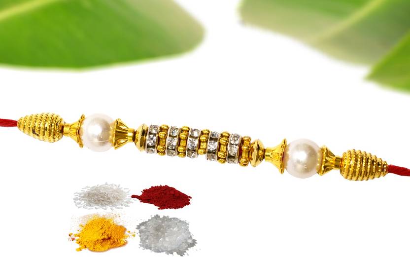 ME&YOU A Beautiful Pearl Rakhi with chawal and roli set. This Rakhi being traditionally designed and handcrafted, fine design, pattern and color tone may vary slightly from that shown in the image. Raksha Bandhan is a festival which celebrates the bond of love between brothers and sisters. It is a day when siblings pray for each others' well being and wish for each others' happiness. Package Content:- 1 Pearl Rakhi with Chawal and Roli