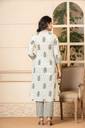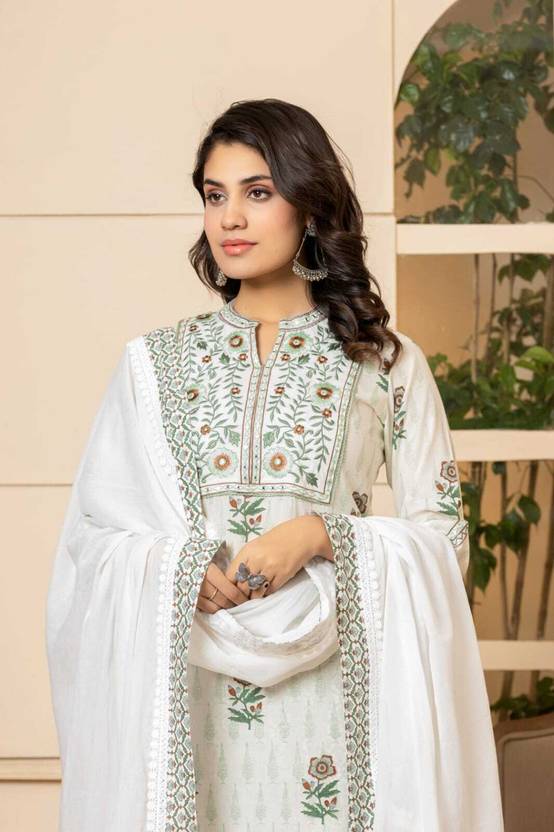 Elegant Ethnic Wear: A traditional Indian kurta pants ensemble, perfect for festive occasions or everyday wear., Vibrant White Hue: Crafted in a pristine white shade, symbolising purity and grace., Comfortable cotton Fabric: Made from a soft, breathable material for all-day comfort., Versatile Design: The suit can be styled with various dupattas and accessories for a unique look., Flattering Fit: Designed to flatter the feminine form with its flowing silhouette and intricate detailing.