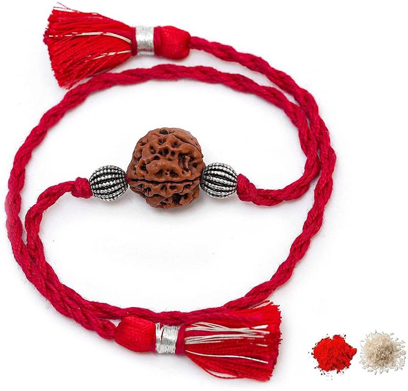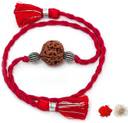 Made in 92.5 Sterling Silver. Handmade Sterling silver beads with real Rudraksh beads in traditional moli thread. This auspicious rakhi can also be wored as a bracelet later. Precious gift for your precious brother. Comes along with roli and chawal; Packed in a traditional pull thread fabric potli.