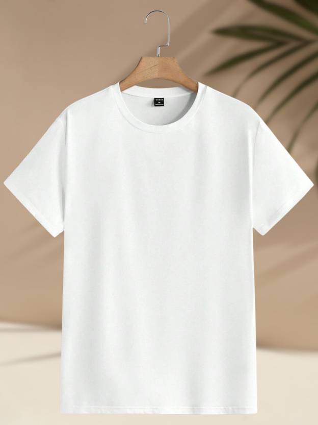 Men Solid Round Neck Cotton Blend White T-Shirt