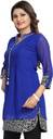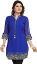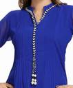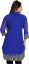 Enjoy the party fret free in this Beautilicious Fine Georgette Party Wear Layered Short Top from the house of Meher Impex. This charming tunic design is equipped with a ban collared neckline that comes decorated with black and white strings and bead accessory and has bunch of pintex running down its shoulders. The top is rounded and double layered at the base with help of a printed white and black fabric. The three fourth net sleeves have fold back cuffs with the same printed fabric.