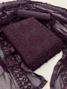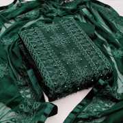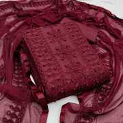 The top part is Chanderi Cotton that's 2.2mtrs. The bottom is sentoon in Pink (2.0mtr) and the inner is pink sentoon (1.70mtr). The dupattas are Santoon Fabric (2.20). The top has embroidered With Mirror Work . This is designed to make you look simple, yet stunning