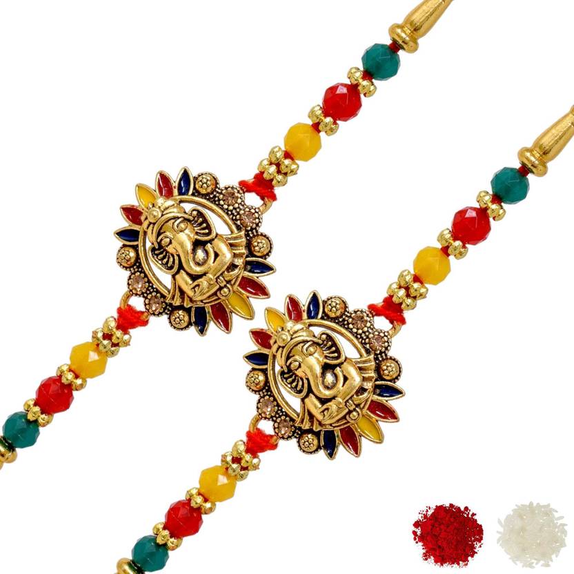 Designer Splendid Ganesha Adornment Combo Set of 2 Rakhi for Beloved Brother Gold Finish Rakhi Set (2 Rakhi, Roli Chawal, Greetings card)
