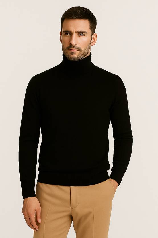 pgrade your winter wardrobe with this trendy black high neck sweater for men, crafted from premium cotton blend fabric for ultimate comfort, warmth, and durability. The solid black high neck design gives a stylish and modern look, making it perfect for casual wear, party wear, office wear, and daily winter fashion. Designed with a regular fit and full sleeves, this versatile sweater keeps you cozy during cold days while ensuring breathability. Pair it with jeans, trousers, or chinos for a smart and fashionable look. A must-have winter wear for men that combines comfort, style, and functionality.