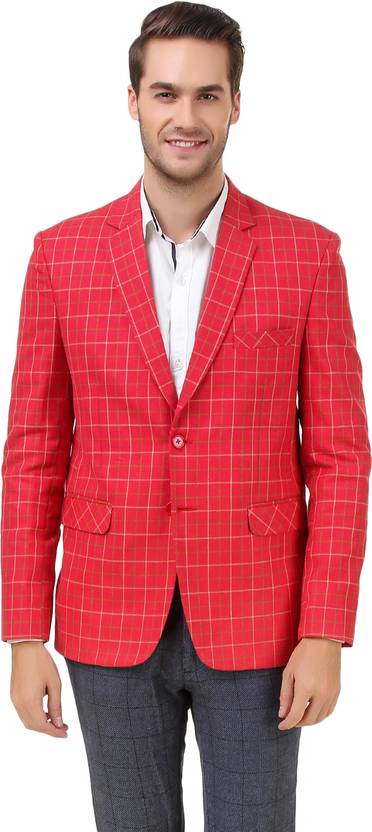 Men Checkered Single Breasted Party, Casual Blazer (Red)