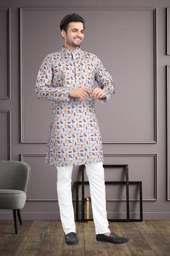 LYPLO Men Printed Cotton Blend Straight Kurta (Grey)