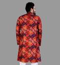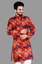 This vibrant men's kurta features a striking geometric print in shades of multicolor, offering a modern twist to traditional ethnic attire. The garment is made from cotton blend fabric, ideal for wearing across different seasons, and is designed with a straight fit and full-length sleeves for a sophisticated