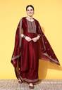 A silk wedding kurta would be a striking choice for a special occasion. Silk adds a luxurious touch and maroon is a deep, rich color that is often associated with elegance and sophistication. Such a kurta would typically be intricately designed, perhaps with embroidery or embellishments, making it perfect for weddings or formal events. Pairing it with complementary accessories like gold jewelry or a contrasting dupatta can enhance the overall look.