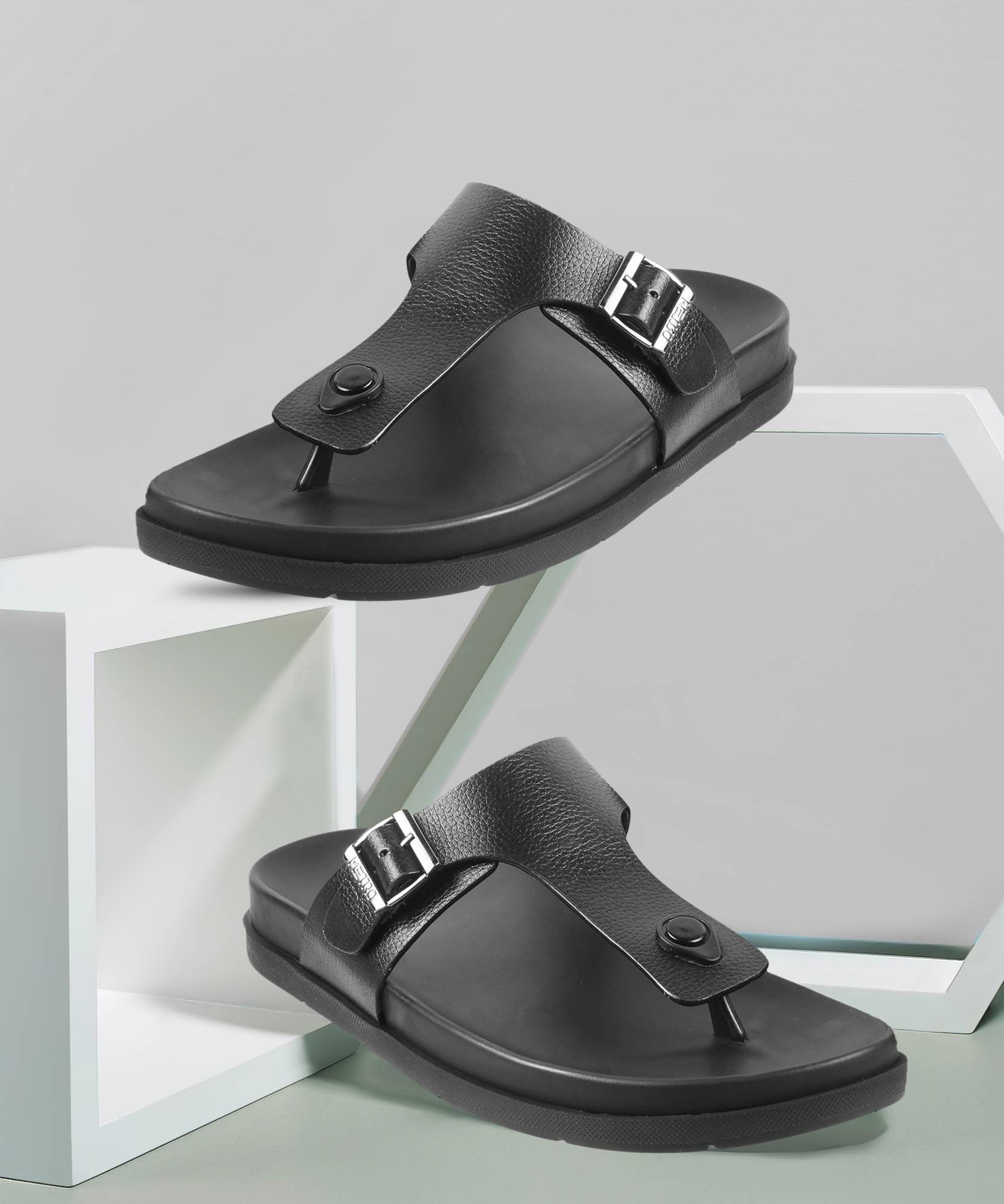 Experience all-day comfort and timeless style with these Mens Black Leather Toe-Ring Sandals. Crafted from premium faux leather, these sandals feature a modern toe-ring design and an adjustable buckle for a secure, customized fit. The cushioned footbed and lightweight sole provide superior comfort and support, making them perfect for daily wear, travel, or casual outings. With their sleek black finish and versatile look, these slip-on sandals easily complement jeans, shorts, or ethnic wear. Step out in confidence and style-enjoy the perfect blend of durability, comfort, and fashion with every stride.