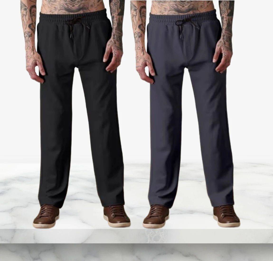This pack of 2 lycra blend track pants offers comfort, stretch, and style in one. Designed with an elastic waistband and drawstring for a perfect fit, they are ideal for gym, travel, or casual wear. The breathable, quick-dry fabric makes them easy to maintain, while the classic Black and Charcoal Grey colors keep your look versatile and stylish.