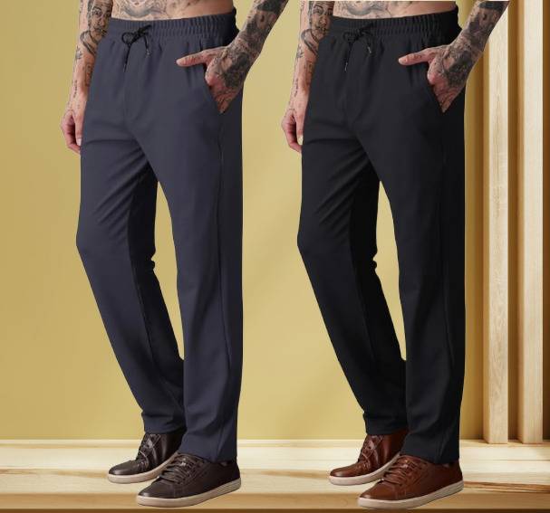 Experience all-day ease with this pack of two lycra-blend track pants, crafted for unmatched stretch and comfort. Featuring a flexible elastic waistband with an adjustable drawstring, these pants deliver a secure yet relaxed fit—perfect for workouts, travel, or everyday lounging. The lightweight, quick-dry fabric keeps you cool and comfortable, while the timeless Black and Charcoal Grey shades add effortless versatility to your wardrobe. Designed for durability and style, these track pants are your go-to choice for active and casual wear.