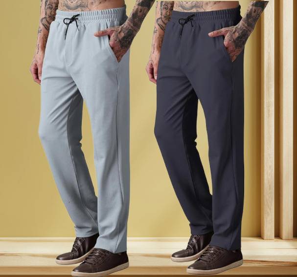 Experience all-day ease with this pack of two lycra-blend track pants, crafted for unmatched stretch and comfort. Featuring a flexible elastic waistband with an adjustable drawstring, these pants deliver a secure yet relaxed fit—perfect for workouts, travel, or everyday lounging. The lightweight, quick-dry fabric keeps you cool and comfortable, while the timeless Black and Charcoal Grey shades add effortless versatility to your wardrobe. Designed for durability and style, these track pants are your go-to choice for active and casual wear.