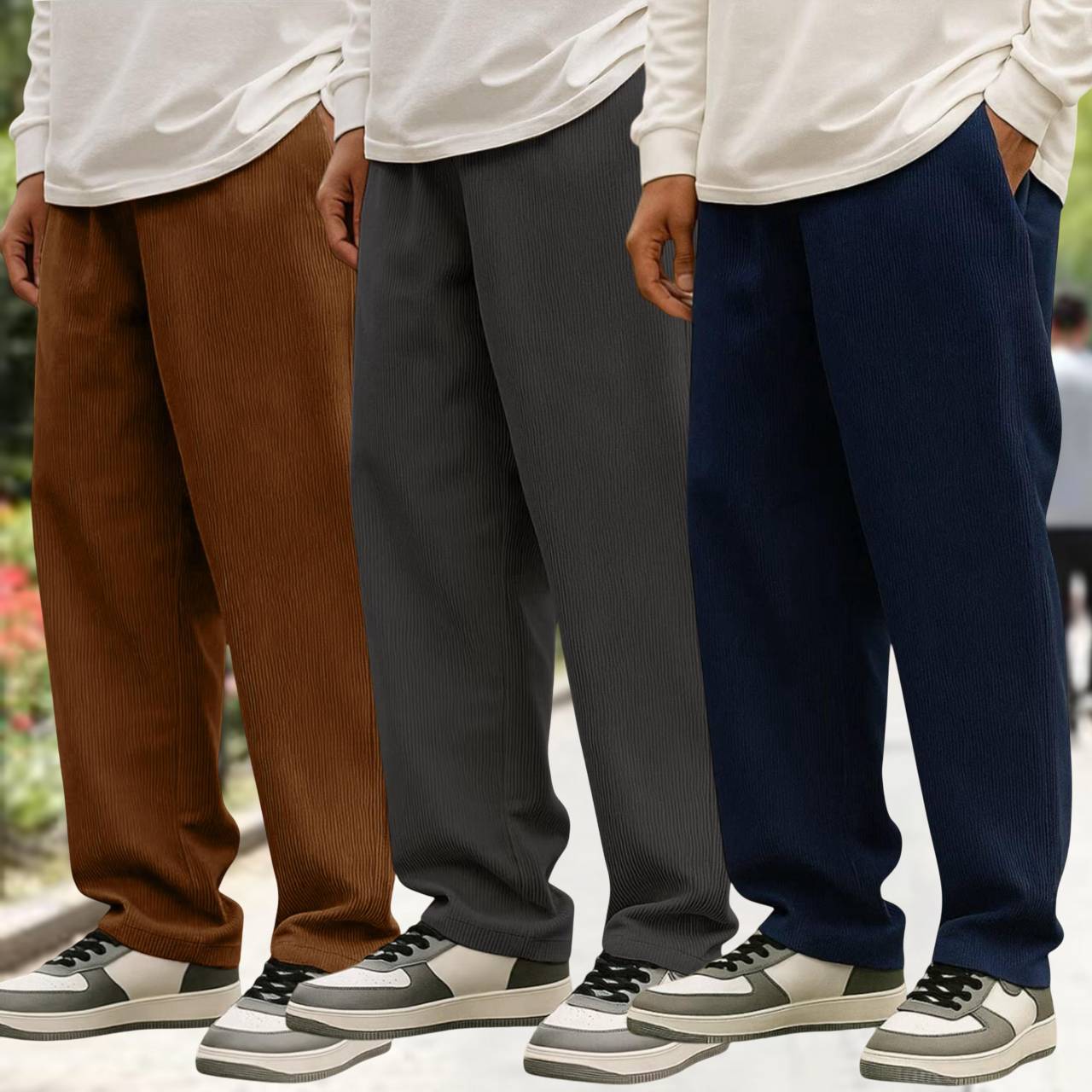 Upgrade your everyday style with these Men’s Solid Relaxed Fit Pants. Crafted from premium soft corduroy fabric, these trousers combine modern streetwear aesthetics with maximum comfort. The relaxed fit allows easy movement, while the elastic waistband with adjustable drawstring ensures a perfect fit. Designed with functional side pockets, these pants are ideal for casual wear, travel, lounging, or daily errands. Pair them with hoodies, sweatshirts, or sneakers for a trendy, laid-back look.