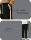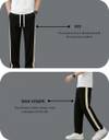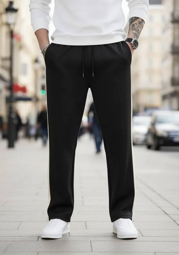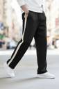 These comfortable black track pants feature a relaxed, loose fit for maximum comfort, making them ideal for casual wear. They are designed with a distinctive white vertical stripe running down the side of each leg, adding a stylish touch. The fabric is soft and comfortable, ensuring ease of movement. These long trousers reach down to the shoes and include practical side pockets and a drawstring waist for an adjustable fit. They can be paired with t-shirts, hoodies, casual shirts, and sneakers for a complete look.