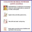 Want to enjoy a healthy complexion and beautiful skin? Add bovine colostrum to a skincare regime, and you may be able to reduce the effects of aging on the skin andsave money on skincare products.It features numerous bioactive components that reflect anti-aging properties which make it a valuable option for those who are looking to reduce acne, wrinkles, and other skincare problems. Aging Uneven skin tone Sensitive skin Dark circles Sun damage FACE MASK-Mix 1-2 tablespoons of powdered Colostrum with enough water or coconut oil to make a thick paste. Apply to face and allow paste to dry. Rise with cool water and pat dry.Easily apply around the eyes at bedtime and wash face in the morning.