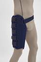 High quality, fabric laminated foam as brace with multiple hook and loop closures for Thigh. Three light weight, metallic splints (anterior, posterior and lateral) to support the Femur. Designed for use on either right or left Thigh.