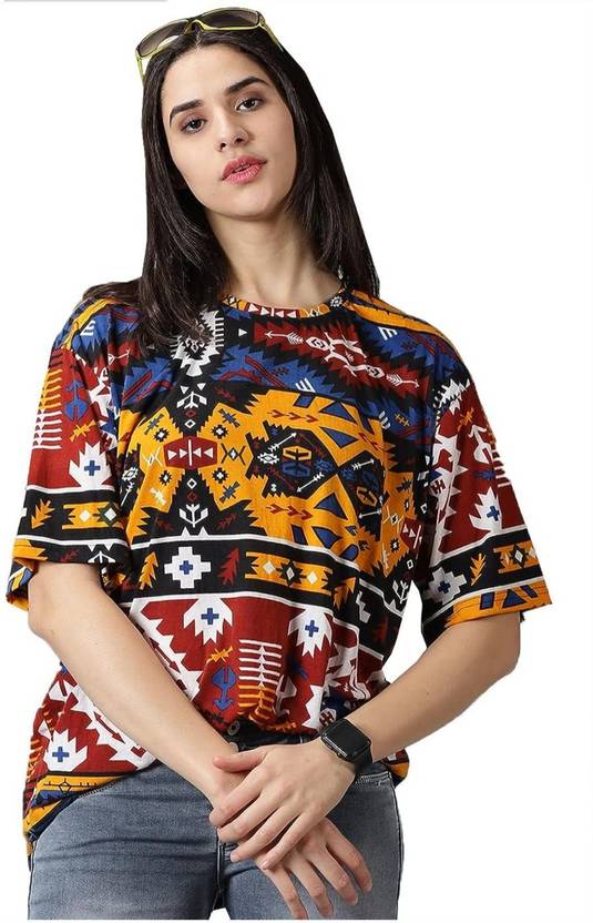 Women Printed Round Neck Cotton Blend Multicolor T-Shirt