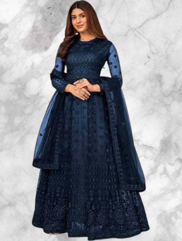 Embroidered Net Semi Stitched Anarkali Gown (Blue)
