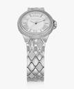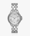 Michael Kors' 33mm Camille watch features a white sunray dial, three-hand movement and stainless steel quilted waterfall pav bracelet.