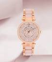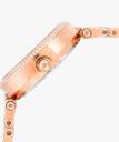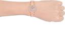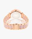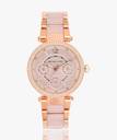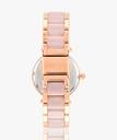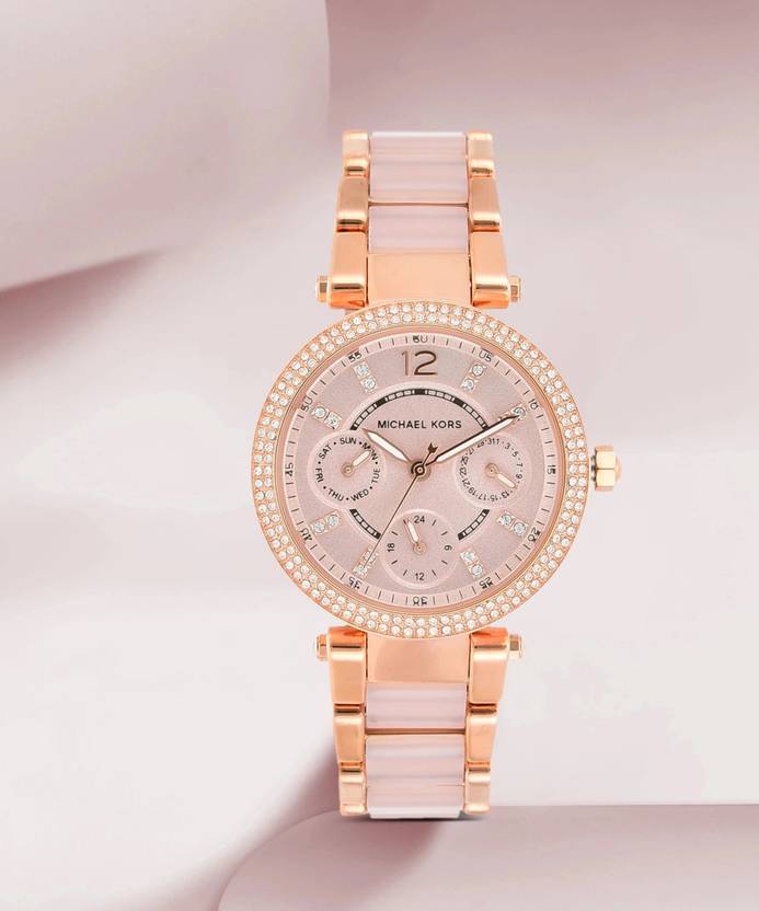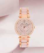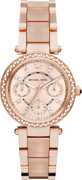 Rose gold-tone stainless steel case and bracelet with blush acetate center links. Fixed rose gold-tone bezel set with crystals. Rose dial with rose gold-tone hands and crystal index hour markers. Arabic numeral marks the 12 o'clock position. Minute markers around the outer rim. Dial Type: Analog. Three multi-function sub-dials displaying: 24 hour, date and day of the week. Quartz movement. Scratch resistant mineral crystal. Pull / push crown. Solid case back. Case diameter: 33 mm. Case thickness: 11 mm. Round case shape. Band width: 20 mm. Deployment clasp. Water resistant at 50 meters / 165 feet. Functions: date, day, hour, minute, second, 24 hour. Casual watch style. Michael Kors Parker Mini Multi-Function Rose Dial Rose Gold-tone Ladies Watch MK6110