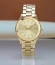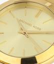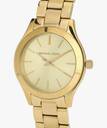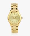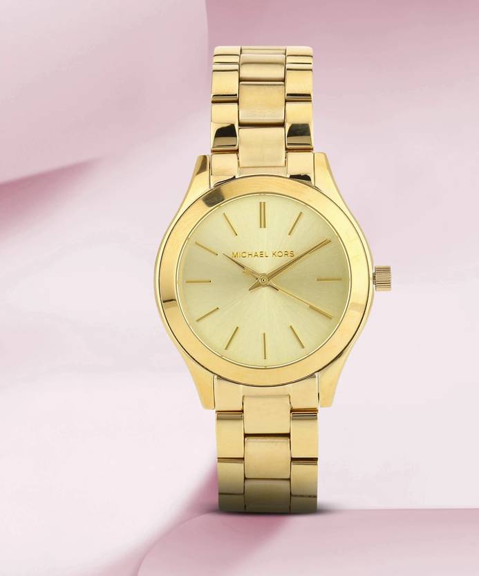 The gold-tone Michael Kors Mini Slim Runway watch is petite perfection. A classic three-link bracelet and monochromatic champagne sunray dial with stick indexes add up to a wear-with-everything timepiece that dresses up and down with ease.