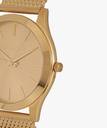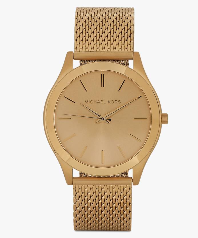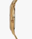 A perennial favorite, this iconic slim Runway men's watch is cast in classy gold-tone stainless steel with a sleek, gold sunray dial has gold three hand movements with gold tone stick indexes, stainless-steel rounded case and gold mesh bracelet secured by safety mesh buckle. The Slim Runway watch that shines with modern flair.